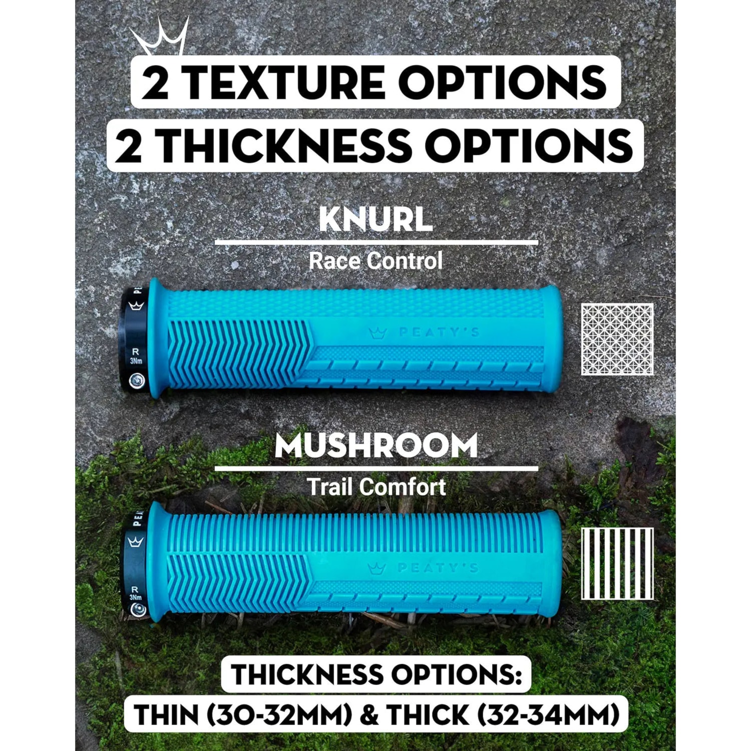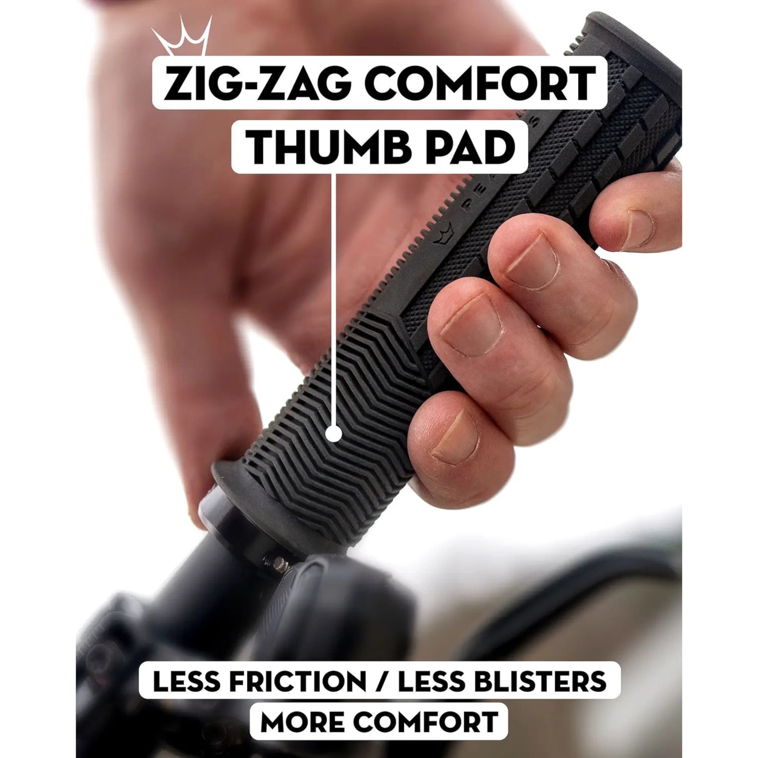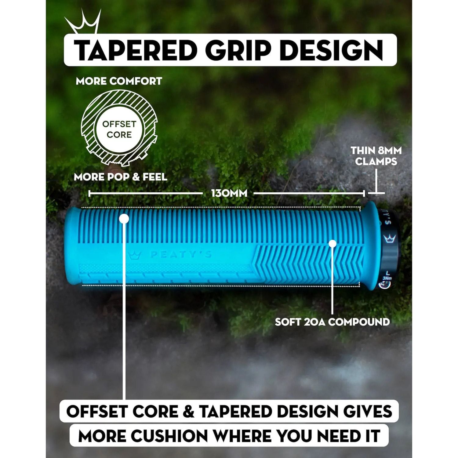 Wieloletnie doświadczenie i skupienie się nie tylko na wydajności, ale także na komforcie sprawiły, że grip ma lekko stożkowy kształt rdzenia, który zapewnia lepszą pozycję dłoni, grubszą warstwę gripu od góry dla lepszej amortyzacji i cieńszą warstwę od spodu dla pewnego uchwytu lub powierzchnię w kształcie zygzaka, która zmniejsza obciążenie kciuków. Ponadto w Peaty's nie zapomniano o czynniku zrównoważonego rozwoju, dlatego rdzeń jest wykonany w dużej części z materiałów pochodzących z recyklingu.