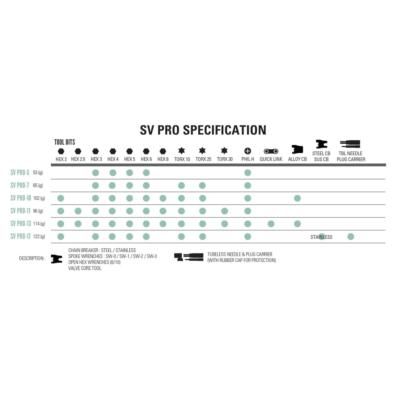 Model SV Pro ze stali nierdzewnej to szczytowe osiągnięcie w dziedzinie projektowania rowerowych narzędzi turystycznych. Poradzi sobie z większością napraw w terenie. Narzędzia są na nowo rozbudowane, a odporność na korozję zapewniona jest dzięki zastosowaniu stali nierdzewnej i aluminium. Ten multi-tool oferuje mnóstwo funkcji w kompaktowym opakowaniu i stylowym wyglądzie.